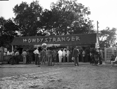 A photograph of the crowd gathered at Shady Oak Farm, in front of the building labelled "Howdy Stranger." This photograph was taken during James A. Farley, Sr.'s visit to Shady Oak Farm.