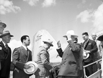 Amon Carter, Sr. greets James A. Farley, Sr. on the tarmac as Farley exits an American Airlines flight at the Fort Worth Airport. Other unidentified men can also be seen in the photograph. This photograph was taken during Farley's visit to Fort Worth and Shady Oak Farm.