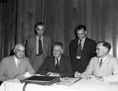 Executive committeemen of the Association of Texas Colleges met Saturday at Hotel Texas and chose Fort Worth as site for their 1942 convention next April. Committeemen present were, seated, left to right, Registrar D. A. Shirley of West Texas State Teachers College, Canyon; Dean Thomas E. Ferguson, Stephen F. Austin State Teachers, Nacogdoches, and Dean O. A. Ullrich, Southwestern University, committee chairman and association president. Standing, Dean C. A. Puckett, Texas College of Mines, El Paso, at left, and President W. H. Elkins, San Angelo Junior College. All men are wearing suits in various colors, belts, and neckties. Elkines and Ullrich are wearing eyeglasses. In the background is a wood grain paneled wall. In the foreground is the table the men are sitting at with various papers and a clipboard on it. Published in the Fort Worth Star-Telegram Morning Edition, June 29, 1941.