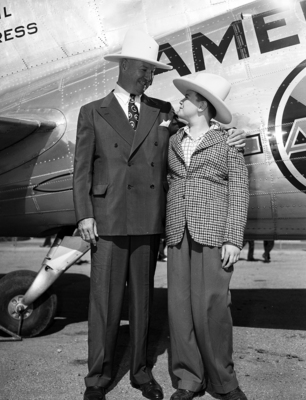 Image shows James A. Farley Senior, left, and his son, James A. Farley Junior, shown at the airport during their visit to Fort Worth, Texas. Farley Senior is a former Postmaster General. Farley Junior is 13 years old. They are standing in front of an airplane, both wearing suits and Shady Oak hats. Farley Senior has his left arm around his son's shoulders. They are looking at each other and smiling. Published in the Fort Worth Star-Telegram evening edition Morning June 29, 1941.