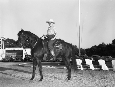 Image shows James A. Farley Junior riding a horse at Shady Oak Farm during he and his father's visit to Fort Worth, Texas. James is wearing a checkered shirt, riding pants, cowboy boots and a Shady Oak hat. He is holding the reins of the horse and looking towards the camera. There are a few older men standing in the background, behind the horse, that are dressed in suits and hats, and another unidentified man is standing at the far right, also wearing a Shady Oak hat. Published in the Fort Worth Star-Telegram evening edition Morning June 29, 1941.