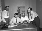 Bomber Plant workers buying defense bonds. Seated at his desk, Captain John H. Anderson, J. Lewell Lafferty, right, bond sale chairman for the Fort Worth Area; at Captain Anderson's right is Matt H. Markum, business agaent of the operating engineers' local union. Seated at Anderson's left is N. R. Crater, construction superintendant for the Austin Company.