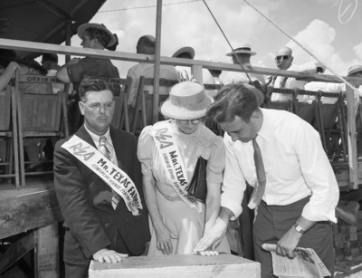 Possum Kingdom Dam; Dams; Dedication; Haygood, W. F. (Mr.); Haygood, W. F. (Mrs.); Gerth, Arthur; Mr. & Mrs. Texas Farmer; Comanche County Electric Cooperative; Rural Electrification Administration; Electric Cooperatives; Cornerstones