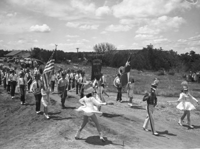 The Stephenville (Texas) High School Band, approximately 30-members, are marching the parade at the Possum Kingdom Dam dedication, July 2nd. They have flag bearers, the drum major and drum majorettes twirling their baton at the helm of the band. They are marching on a narrow dirt road.