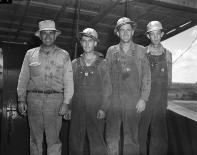 Oil field workers. Drilling crew of the States Oil Corporation, of Eastland, Number 10 J. P. Morris Estate, J. P. Stone survey Number 6, left to right Bill Kelley, driller; A. B. Baynes, Floorman; Ode Sheffield, derrick man and Earl Hillhouse, Motorman. They are standing next to each other and posing for a picture. Published in Fort Worth Star-Telegram, morning edition, July 6, 1941.
