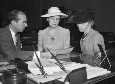 W. H. Larson, Junior, of the bond department of the Fort Worth National Bank, selling 10 $100 defense bonds to Miss Ruth Kirkman, center, and Miss Mattie Daniels, right. The women, incoming and outgoing treasurers, respectively, of the Fort Worth, Texas, Classroom Teachers Association, made the purchase on behalf of the organization. The three are sitting behind a desk and are all wearing eyeglasses. On the desk is a pen stand, stapler, and various documents. Mr. Larsen Jr. is wearing a suit and the teachers are wearing dresses and hats.