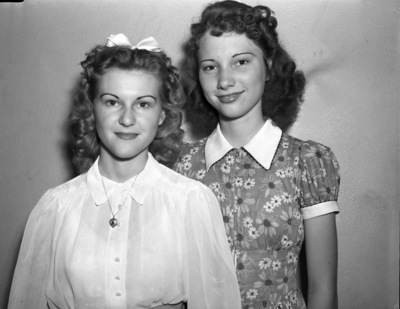 Miss Evelyn Wilson, left, and her guest, Miss Margaret Anne Jordan, of Abilene, Texas. Miss Wilson was a June 1941 graduate of Polytechnic High School, and Miss Jordan will be a senior in the fall. They are standing against a wall. Miss Wilson is wearing a long-sleeve blouse, necklace, and a bow in her hair. Miss Jordan is wearing a floral print dress.