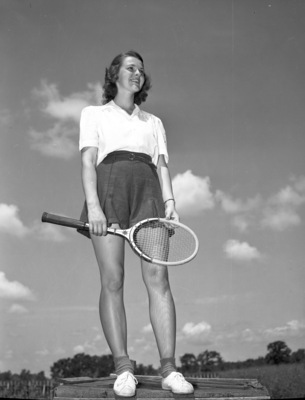 Mrs. Richard Davis Walker is dressed for tennis practice, her favorite sport. She is wearing a collared blouse tucked into shorts and is holding a tennis racket. She is standing outdoors. Mrs. Walker was married March 3, 1941. She is the former Miss Helen Milavec, an airline hostess. She is the daughter-in-law of Doctor and Mrs. Webb Walker.