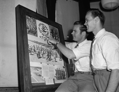 The Harner Twins recently enlisted in the military at the Fort Worth Army Recruiting Station. They are shown examining a sign that reads, "Let's Go! U. S. A. Keep 'Em Flying." The 20-year-old Cleburne, Texas, natives, left to right, are Veston Harner and Vestal Harner. They have tentatively been assigned to the Air Corps at Jefferson Barracks, Missouri. Both men are wearing polka-dot dress shirts, neckties, and trousers.