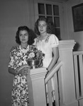 Mary Hallett Fry of Marshall, Texas, left, who is the guest of Betty Claire Schmid, Fort Worth, Texas. The women were previously roommates at Wellesley College. They are standing on a stairway landing. There is an arrangement of flowers sitting on a newell. Both women are wearing patterned dresses. Their is a closed door behind them and a painting o the wall, also behind them. This photograph was published in the July 13, 1941 morning edition of the Star-Telegram.