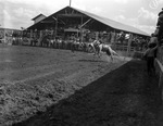 Action galore has been furnished by the bronc riders at the twelfth annual anniversary Texas Cowboy Reunion in Stamford this year. The pictures, taken in the arena Friday afternoon, show high points in the two exciting rides and a sensational swan dive spill. The image captures a horse in action and an identified person falling off the horse. There are crowds in the stadium in the background.