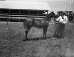 These were among the many animals in the Second Annual Show of the American Quarter Horse Association held at Stamford during the 1941 Cowboy Reunion. Here is Mr. and Mrs. Warren, seen with their attractive yearling, Mollie O'Daniel. This colt is by Alazan and out of Mollie. Warren is president of the association and an enthusiastic admirer of the quarter horse. Mr. and Mrs. Warren are standing next to their horse. There is a stable in the background.