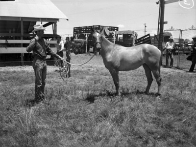 Second Annual Show of the American Quarterhorse Association at Stamford. Here is Marietta, a yearling owned by R. E. Underwood of Wichita Falls. At the halter is Rowland Moore. Moore is wearing a shirt, trousers and a cowboy hat. There is a stable and few unidentified people in the background.