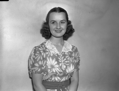 Miss Dorothy Harrison is the assistant manager of Worth Theater. She is standing against a wall, wearing a floral print dress with a lace collar and a belt around her waist.