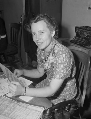 Miss Fannie L. Owen is shown at her desk at the Parkway Theater, where she worked for two weeks as assistant to Lowell Bodiford, manager. She is now performing the same assistant manager duties at the Palace Theater, where she is employed regularly as a cashier. She is wearing a floral print dress with flowers pinned to the dress collar and a watch on her left wrist. She is holding a piece of paper. On the desk are other papers and a telephone. In the background is a typewriter on a small desk.