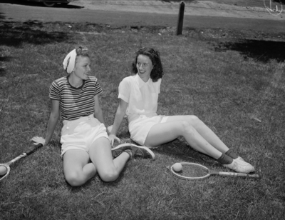 Fourth of July celebrations are continuing in Fort Worth, Texas, throughout the holiday weekend. Resting on the grass after a tennis match at Forest Park, left to right, are Miss Jean Johnson and Miss Dorothy Kline. Miss Johnson is wearing a striped blouse, shorts, and a ribbon in her hair. Miss Kline is dressed in a button-up blouse and shorts. Their tennis rackets and tennis balls are beside them in the grass.