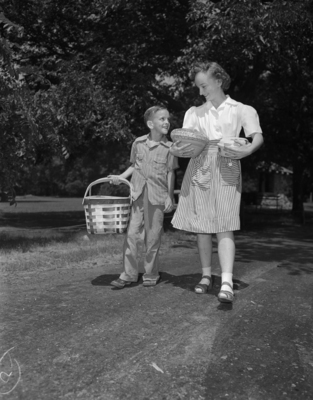 Fourth of July celebrations are continuing in Fort Worth, Texas, throughout the holiday weekend. The North Fort Worth Baptist Church is hosting a picnic at Rockwood Park. Preparing their lunch, left to right, are Bobby Roach and his sister, Kathryn Roach. Bobby is carrying a picnic basket. He is dressed in a short-sleeve button-up shirt and trousers. Kathryn is carrying two serving dishes. She is wearing a collared blouse and a striped skirt.