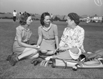 Fourth of July celebrations are continuing in Fort Worth, Texas, throughout the holiday weekend. Three women are shown resting after a tiring round of golf at Worth Hills. They are, left to right, Mrs. S. R. Normand, Mrs. Tom Prouse and Mrs. Drew Jones. They hope to one day break 100, and in an effort to do so, they play several times each week. Their husbands are also regulars at the course. Mrs. Normand is dressed in a striped button-up blouse and a skirt. Mrs. Prouse is wearing a dress with buttons along the top. Mrs. Jones is dressed in a blouse with cartoon pictures and trousers. Her hair is wrapped in a hairnet. The women's golf clubs are on the grass beside them.