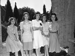 All over Fort Worth, Texas, residents are celebrating the Fourth of July. Five girls are sharing honors at a patriotic tea hosted by Mrs. Hubon Holton. The honorees, left to right, are Miss Margie Cowan, Miss Paula Murchison, Miss Virginia Walker, Miss Molly O'Daniel, and Miss Mary Katherine Elliott. Miss Cowan is from Archer City, Texas. She is wearing a striped dress with buttons along the top and a pearl necklace. Miss Murchison is the bride-elect of Mr. Neal Campbell. She is wearing a button-up dress with horizontal stripes. Miss Walker, of Littlefield, Texas, is wearing a light-colored dress. Miss O'Daniel, of Austin, Texas, is the daughter of Texas governor W. Lee O'Daniel. She is wearing a button-up dress and a pearl necklace. Miss Elliott is the daughter of the hostess and a college classmate of Miss O'Daniel. Miss Elliott is wearing a button-up dress, belted at the waist.