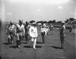 The observance of the Fourth of July in Fort Worth, Texas, is a mixture of patriotic affairs and recreation of many forms. Brigadier General J. Watt Page, adjutant general of Texas, is visiting Farrington Field. He wearing a Summer white dress uniform. He is shown reviewing the 27th Battalion, Texas Defense Guard. In the foreground, left to right, are Mayor I. N. McCrary and Major John W. Herbert. Mayor McCrary is the mayor of Fort Worth. He is dressed in a hat and a double breasted suit. Major Herbert is the battalion commander. He is wearing a military uniform.
