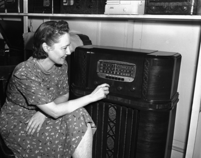 The observance of the Fourth of July in Fort Worth, Texas, is a mixture of patriotic affairs and recreation of many forms. Mrs. Laura York is shown tuning in her radio just before three o'clock. President Franklin D. Roosevelt is addressing the American people with a message about "preservation of their cherished liberty." Mrs. York is wearing a floral dress and a necklace.