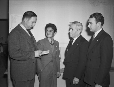 The Golden Gloves state tournament is being held in Fort Worth, Texas at the Will Rogers Memorial Coliseum. Left to right are Norman Earl, Jose Andreas, Reverend G. A. Walls, and Dan Coates. Mr. Earl is dressed in a three piece suit. The Golden Gloves eligibility chairman, is checking the amateur record of Andreas, a Mexican boxer. The seventeen year-old Andreas won the Fort Worth district flyweight title to advance to the state tournament. He is wearing a suit with a sweater underneath. Reverend Walls is dressed in a double breasted suit. Mr. Coates is wearing a double breasted pinstripe suit.