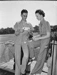 The observance of the Fourth of July in Fort Worth, Texas, is a mixture of patriotic affairs and recreation of many forms. Hitting the links for a day of golf are R. B. Hudgins and Mrs. Hudgins. They are tallying their score after their first trip around the nine-hole Sycamore Golf Course. The small course has become one of the city's most popular layouts. It had 191 players over the holiday. Mr. Hudgins is wearing a button-up shirt and trousers. Mrs. Hudgins is dressed in a collared blouse and trousers.