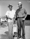The observance of the Fourth of July in Fort Worth, Texas, is a mixture of patriotic affairs and recreation of many forms. Prepping for a round of golf over the holiday weekend, left to right, are C. E. Miller and Roy Yager. They are shown cleaning their golf balls at the nine-hole Sycamore Golf Course. The small course has become one of the city's most popular layouts. It had 191 players over the holiday. Mr. Miller usually scores just over par, between 32 and 38. He is dressed in a hat, button-up shirt, and trousers. Mr. Yager frequently breaks par (30). He is wearing a straw hat, and a collared shirt tucked into his trousers.