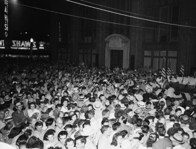 Fourth of July; Fourth of July celebrations; United Service Organization (U. S. O.); Military; Camp Bowie; Camp Barkeley; Crowds; Celebrations; Shaw's Jewelry Store; Downtown Fort Worth; Fort Wolters (Tex.)