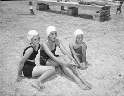 The observance of the Fourth of July in Fort Worth, Texas, is a mixture of patriotic affairs and recreation. One of the most popular locations to spend the holiday is Forest Park Pool. Cooling off with a swim, left to right, are Janice Fenimore, Evmarie Powers, and Marilyn Fenimore. Evmarie is hosting her cousins who are visiting from St. Louis, Missouri. The girls are shown in the shallow end of the pool. They are wearing swimsuits and bathing caps.