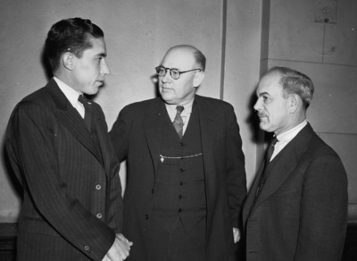 Big Bend Park Project, rally. Left to right, Tommy J. Reynolds, Austin, Texas; professor G. Preston Smith, Alpine, Texas, director of teacher training at Sul Ross Stare Teachers College and Authority on the Big Bend Country, and John C. Diggs Austin, inspector for the National Park Service. The three men wear suits and look at each other. Published on February 10, 1940.