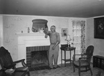 Home of J. S. Trapp with his brother Charles E. Trapp standing in one of the living rooms. Charles helps with the farm work. He is is wearing a pair of eyeglasses and looking to his right. Charles is shown leaning against the fireplace. There are small figures on the mantle of the fireplace, including one of a swan, and a mirror that hung above it. Close to the fireplace are chairs and small tables. This home is a nine-room Cape Cod country home which J. S. Trapp remodeled from a 65-year old farm dwelling in his property, situated west of Fort Worth on Highway 80. Published in the Fort Worth Star-Telegram morning edition, July 6, 1941.