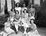 "New officers of W. A. W. Club who were recently installed, include, front, left to right, Misses Betty June Thompson, reporter; Mary Helen Journey, business manager; Mary Jean Durham, president; Patsy Bode, parliamentarian; Ruth Steinhauser, vice president; and Vickie Moran, treasurer. In the back, from left to right, Jean Gibbs, recording secretary; Junene Doak, pledge mistress; and Sue Moore, corresponding secretary." The young women on either end of the front row, Miss Thompson and Miss Moran, are sitting on the the grass. The other four young women are sitting either in a lawn chair or on the arm of a lawn chair. The three young women in the back row are standing just behind them. The group is positioned between two houses, which are seen in the background, along with some foliage."