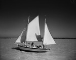 One of the biggest boats at Eagle Mountain Lake is the motorized ketch, "Betsy." The crew members are Dorothy Campbell (seated on the cabin), Jimmy Ross (nearest camera), and Bonilee Key and Skipper Gavin Goodrich behind the wheel. Published Fort Worth Star-Telegram Morning Edition July 6, 1941.