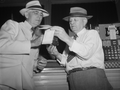 The Sixth Annual XIT Rodeo and Reunion is being held in Dalhart, Texas. The lively event draws large crowds, often doubling the town's population. Some of the visitors in the spotlight, left to right, are Dr. J. A. Hill and W. D. Twichell. The men are discussing a book of field notes surveying XIT land. Dr. Hill, of Canyon, Texas, is the president of West Texas State Teachers College. He is dressed in a hat and a double breasted suit. Mr. Twichell, of San Angelo, Texas, worked as an assistant to the surveyor of XIT lands starting in 1886. He is wearing a hat, striped dress shirt, necktie and trousers.