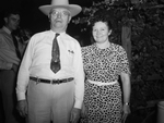 The Sixth Annual XIT Rodeo and Reunion is being held in Dalhart, Texas. The lively event draws large crowds, often doubling the town's population. Some of the visitors in the spotlight, left to right, are Hugh H. Williams and Mrs. Hobart Barnes. Mr. Williams, of Wichita, Kansas, formerly ranched in the Dalhart area. He is dressed in a cowboy hat, button-up shirt, paisley necktie, and trousers. Mrs. Hobart Barnes is a Dalhart native. She entertained guests at the chuck wagon supper. She is wearing a dress with a sunflower pattern, belted at the waist.