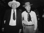 The Sixth Annual XIT Rodeo and Reunion is being held in Dalhart, Texas. The lively event draws large crowds, often doubling the town's population. In attendance, left to right, are Jack Potter and L. S. "Tex" Crosse. Mr. Potter, of Clayton, New Mexico, blazed a trail for cattle drives from South Texas to Wyoming 60 years earlier. He is dressed in a cowboy hat and a dark suit. Mr. Crosse, of Los Angeles, California, worked on the XIT Ranch in 1895. He is wearing a hat, button-up shirt, necktie, bandanna, and trousers.