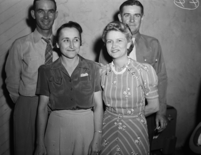The Sixth Annual XIT Rodeo and Reunion is being held in Dalhart, Texas. The lively event draws large crowds, often doubling the town's population. In attendance, left to right, on the back row, are H. L. Peeples, and Neal Freeman. On the front row are Mrs. Peeples and Mrs. Freeman. Mr. Peeples is the Mayor of Dalhart. He is wearing a dress shirt, necktie, and trousers. Mr. Freeman is dressed in a button-down shirt, necktie, and trousers. Mrs. Peeples is dressed in a button-up blouse and a skirt. Mrs. Freeman is wearing a floral, striped dress.