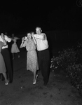 The Sixth Annual XIT Rodeo and Reunion is being held in Dalhart, Texas. The lively event draws large crowds, often doubling the town's population. In attendance are Joe Reynolds and Mrs. Joe Scott. They are shown dancing among a crowd of people. Mr. Reynolds, of Fort Worth, Texas, is dressed in a striped button-up shirt and trousers. Mrs. Scott, of Dalhart, is wearing a floral dress.