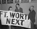 John Sherman (center), president of Fort Worth Florists Club, and Will J. Baker, district representative of Floral Telegraph Delivery Association, shown with sign they will take to the State Florists convention at San Antonio. Mrs. Sally Tillery, Chamber of Commerce receptionist, is at their left. All three are holding the banner that reads "FT. Worth Next" to send the message of "Come to Fort Worth in 1942" at the convention. Both men are wearing suits and ties and eyeglasses. Mrs. Tillery is wearing a jacket and skirt ensemble. Behind them is a tiled wall. The association last met in Fort Worth, Texas in 1937 and is due to meet there again as the city is considered a center of floral activity. Published in the Fort Worth Star-Telegram morning edition, July 6, 1941.