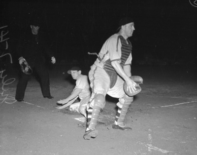 Bill Cronin, Dallas Rebels catcher, blocking the plate as a Fort Worth Cat player slides in. Cronin is shown standing over the base with legs apart and his knees bent. Heis wearing his baseball uniform under his catcher's gear. His gear includes leg guards and a chest plate. He is also wearing a baseball glove in his left hand. The unnamed Cat player is close behind him on the ground. An umpire looks on behind the duo, at left.