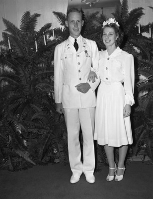 Lieutenant Robert A. Geisler, left, and his bride, the former Miss Mary Von Zuben, were photographed at the home of the bride's parents, Mr. and Mrs. F. J. Von Zuben, where they were married July 5, 1941. The couple will be at Brownwood, Texas, where Lieutenant Geisler is stationed at Camp Bowie. Lieutenant Geisler is wearing a suit decorated with military insignia and emblems. Mrs. Geisler is wearing a long-sleeve dress and has flowers pinned in her hair.