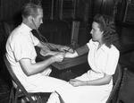 Doctor H. B. Griffin, intern at Harris Memorial Methodist Hospital, taking the blood pressure of Miss Doris Perry, a soon-to-be nursing student at the Harris School of Nursing. She is wearing a button-down dress and a watch on her left wrist. Dr. Griffin is wearing his uniform.