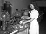 Perry, Doris (Miss); Dresses; Students; Hospitals; Cafeterias; Harris Memorial Methodist Hospital; Harris School of Nursing; Tableware; Trays