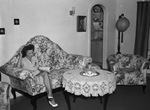 Berlin House Furnishings Follow Refugee Couple -- Mister and Misses Ted Samosch, Jewish refugees who escaped from Germany during the Holocaust and are now living in Fort Worth, Texas. Their home at 2556 Cockrell Avenue reflect a bit of old Germany which they have transplanted into Fort Worth. Their furniture was shipped from Berlin after payment of a heavy tax. Mrs. Samosch is shown here with some of these furniture. She reclines on an odd-shaped living room couch in the adjoining room and reading a magazine. There is a matching armchair in the corner. The table in front of her and the balloon-shaped lamp in the corner also formerly graced the couple's spacious Berlin home. Mrs. Samosch is dressed well. Published in The Fort Worth Star-Telegram evening edition, July 10, 1941.