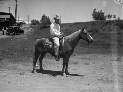 He is one of the three ranch folks who have been in the limelight of the news during the 1941 rodeo season. His name is Quincy Reeves, manager of the Shelton Ranch near Nari Visa, North America, pictured on the good cutting horse he rode at the Stamford Cowboy Reunion. Reeves is one of the judges at the XIT Reunion in Dalhart. There is an automobile in the background.