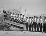 Police Chief Howard led this group of policemen aboard an American Airlines plane for a 30-minute ride as a reward for their record of politeness. Left to right are Chief Howard, Lieutenant R. R. Howerton, B. F. Stevens, F. L. Schnell, J. D. Dunwoody, C. C. Carmichael, C. S. Hightower, C. C. Dews, W. J. Ewing, Sam McGee, H. W. Carter, D. W. Stephenson and N. C. Potter. The policemen are lined up, waiting to board the plane. They are wearing their police uniforms.
