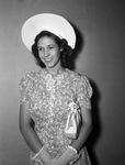 Miss Alannette Wells Stallings, of Newport, Arkansas, who is visiting her grandmother, Mrs. W. R. Wells, in Fort Worth, Texas. Miss Stallings is standing against a wall, wearing a cherry print dress, gloves and a wide-brimmed hat. She has her handbag tucked under her left arm.