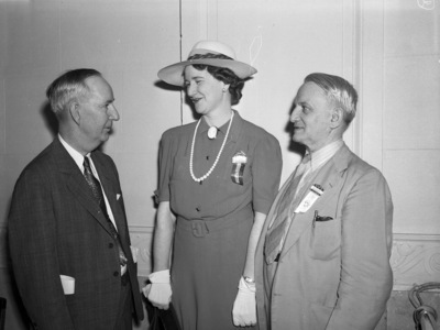 Postmaster Henry Young, left, of Fort Worth, Texas, welcomes Mrs. L'Bertie Rushing, of Glenville, Georgia, national president of the League of District Postmasters, and Jesse C. Harraman, of Washington, D. C., assistant superintendent of the parcel post division. Mr. Young and Mr. Harraman are wearing suits. Mrs. Rushing is wearing a dress, necklace, gloves and a hat.