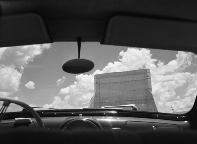 Car back-seat view of the 60-foot-high screen for the first drive-in theater in Fort Worth, Texas, the Bowie Boulevard Drive-In Theater, located at the west end of Camp Bowie Boulevard.